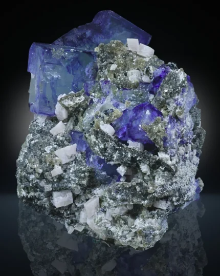 A classic locality piece from the world-famous Yaogangxian Mine in Hunan Province, this Blue Fluorite specimen combined with Calcite represents one of the most respected fluorite-producing regions in the mineral world.